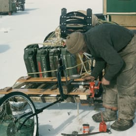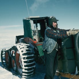 Murray Ellis re-fuelling tractor on the Polar Plateau. Photo M Ellis