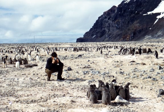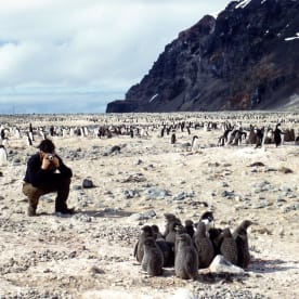 Peter Macdonald and Adelie Penguins Cape Hallet. Photo H Orr