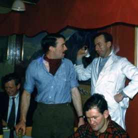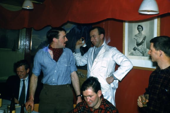 Midwinters Dinner Scott Base 1957. L to R Bernie Gunn Bill Cranfield Murray Ellis Trevor Hatherton Peter Mulgrew. Photo H Orr