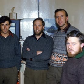 IGY team at Scott Base. Herbie Orr ,Peter Macdonald, Neil Sandford ,Trevor Hatherton, Vern Gerrard. Photo H Orr