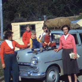Wives & children visit the Hermitage. L to R Louise Hillary, Jan Miller, Peter Hillary, Jane Ayres, Roger Miller, Marjorie Miller. Photo B Miller
