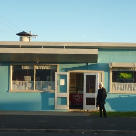Robin in front of the real Maketu Fish and Chips shop in 2015 (PHOTO: Supplied)