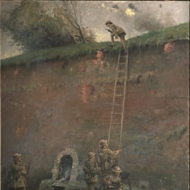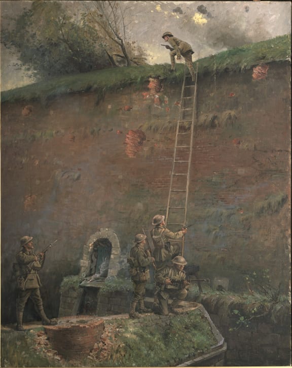 George Edmond Butler͛s careful recreation of the scaling of the walls, showing Second Lt Leslie Averill on the grassed mound, with Second Lt Harry Kerr about to ascend. The three riflemen are Privates Howden, Haxton and Peters. It seems they followed Second Lt Phillip Lummis up the ladder, (not in painting). After them came Major Harold Barrowclough, his signaller and then Lt Selwyn Kenrick. George Edmond Butler, ͚Capture of the walls of Le Quesnoy͛, oil, 1532 x 1220 mm, AAAC 898, NCWA 535, Archives NZ