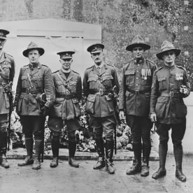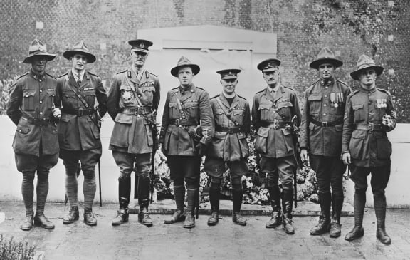 Left to right: Corporal F.T. Jenner, Lieutenant L.C.L. Averill, MC (first man to enter the town over the walls), Lieutenant-General Sir Alexander Godley, Lieutenant F.W. Lang, Rev. M. Mullineux, Colonel G.N. Johnston, Corporal E. Thomas, and Sergeant Harry Moscroft, Credit: The Central Press Photos Ltd, Ref: PAColl-6181-19, Alexander Turnbull Library, Wellington
