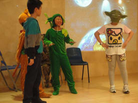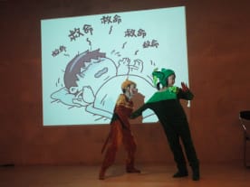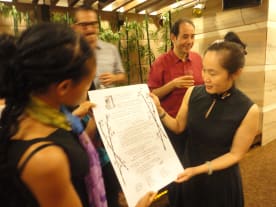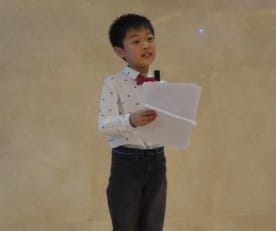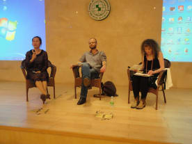 Professor Dai introduces writers Philip Langeskov (U.K.) and Patricia Foster (U.S.).
